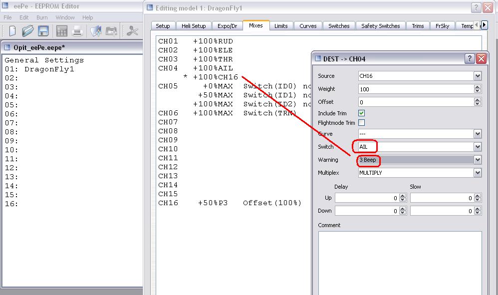Понеже аз бях сложил ключе в канала където се чете потенциометъра като източник (СH16), то затова при изключването на ключето направо се убиват миксерите в които участва канала на потенциометъра. Това е така защото при изклюване на ключето CH16 би подал направо нула, а в другия микс умножаваме по нула и съответно резултата е нула. Това не е правилно