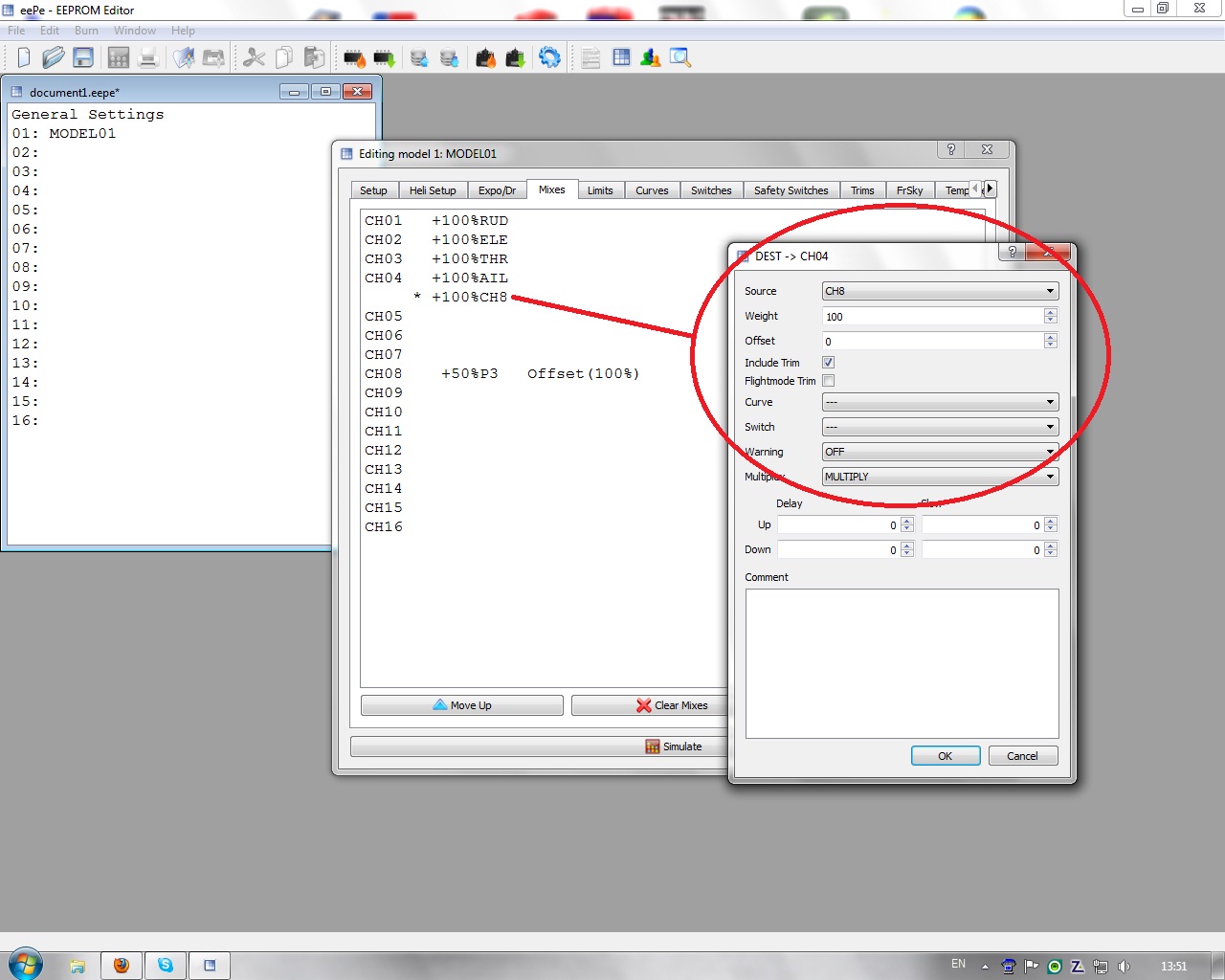 С потенциометъра мога да избирам обхват на елероните от 0 до 100% дори по време на полет....кеф ти голямо отклонение, кеф ти малко, та дори - хич. Динамично в зависимост от това как се държи самолета, с потенциометъра можем да намаляваме и увеличаваме наклона на кривата, като по този начин "в движение" успокояваме модела . Канал 8 е избран произволно.....може да бъде всеки един от неизползваните.