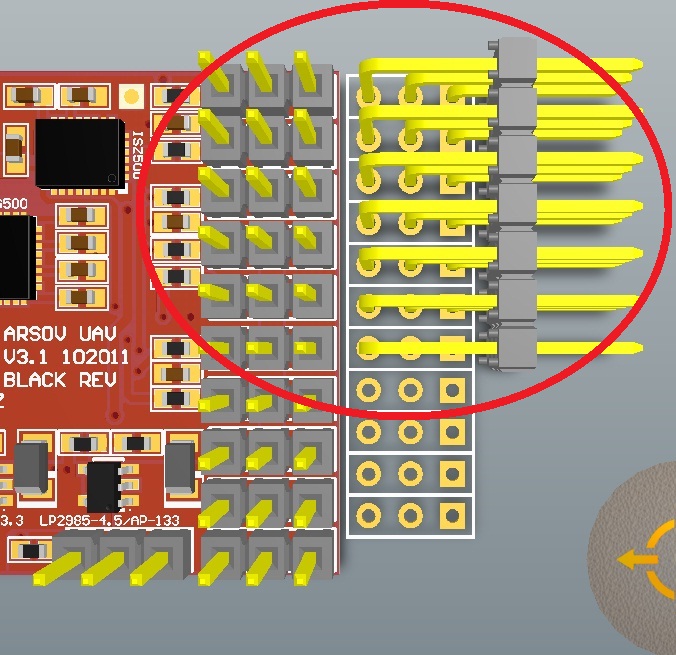 Във втория случай - ъглов съединител, съединителите/кабелите излизат хоризонтално ( по продължение на платката ), но стъпката е 2.54мм., което ограничава видовете използвани серво съединители. Втория вариант има едно предимство - приемника може да се подключи към автопилота не с N на брой 3-ни съединители, а с един 3..4..5 изводен съединител, включен хоризонтално и провеждащ само сигналите и един 3-ен съединител, който да даде (+) и (-). По този начин снопа кабели от приемника към автопилота става доста по-компактен.