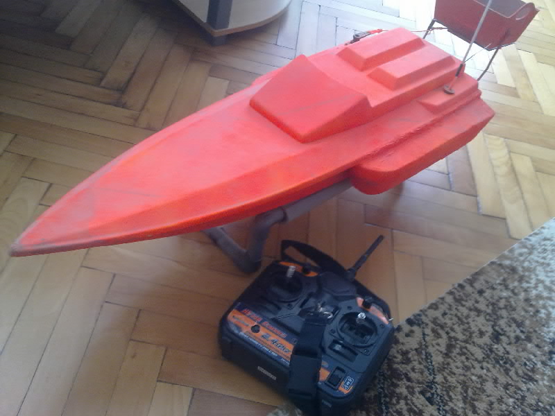 Корпуса е купен от Англия, не се продава тук,или поне аз не съм го виждал...от някаква пластмаса е..една такава особена..не е много твърда,но явно за да е здрава и да поема удари без да се пука.Лодката разпъва по една въдица,отзад не знам дали се вижда има кофичка на която дъното се отваря(със серво машинка),когато ти решиш.На Пясъчник съм я тествал на язовира...на макарите имам по 370 м. корда....развива ги...т.е. във вода ти гарантирам 370м. което е достатъчно..щото на повече няма да виждаш лодката...а на суша съм я пробвал,обхвата е около 600м. Работи с един акумулатор от 6 вт.И не съм имал ядове с нея...продавам я защото всичко на всичко ходих един път за риба ,тази година и даже не я носех.Апаратурата е 4-канална ,на hobby king чисто нов е на един месец е. два броя акумулатори по 6v-7ah чисто нови и 16 броя батерии по 3000 mAh и специално изработен калъф за лодката, със стойка за лодката и зарядно за батериите на лодката,давам още и зарядно за батериите на предавателя. ЦЕНАТА Е 540 ЛЕВА ТЕЛ 0878172434 ПЕШО Click image for larger version