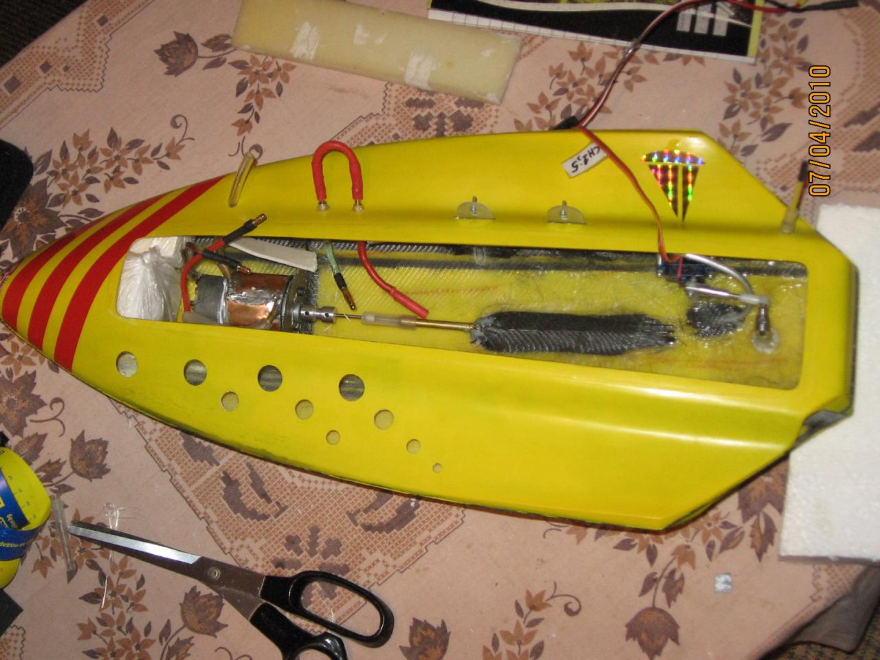 Много добре си се справил.. Бих те посъвтвал да махнеш този студопор от носа-поема влага и постоянно ще ти се" изпотява" модела от вътре.Можеш съвсем спокойно да залепиш с топъл силикон 3 топчета за тенис на маса и няма да имаш никакви ядове.И ако позволиш още един съвет....По правилника на Навига,външния кабел/прекъсвач/ на палубата на модела трябва да се изключва по "посока на движение на модела" Т.е. като се издърпа ухото на кабелчето назад/а не на страни както в твоя случай/ трябва да се изключи мотора...Не ме разбирай погрешно,знам че и така става,но искам да ти спестя евентуални проблеми с регистрацията по състезания...И още веднъж поздравления!