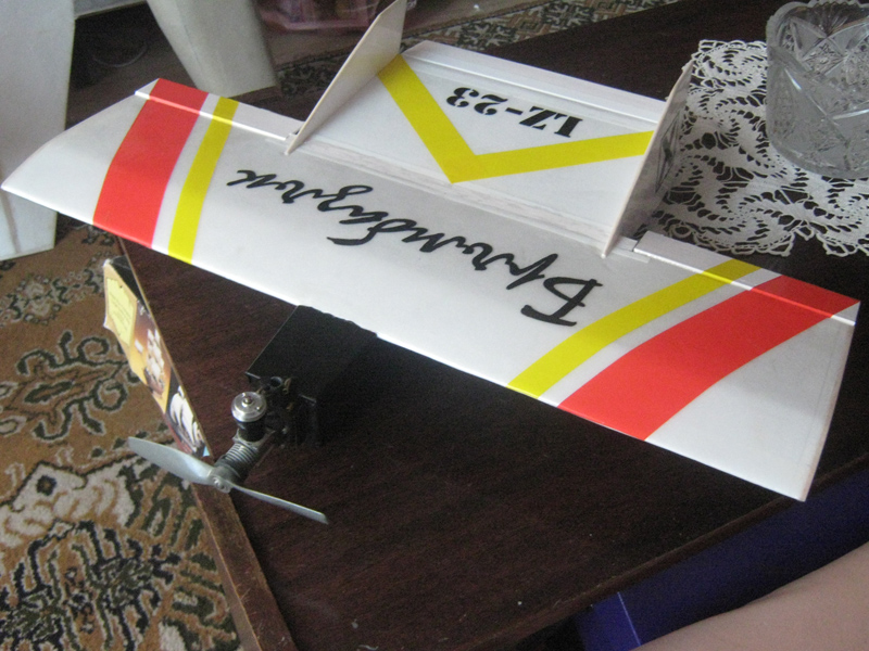 Това е първото отроче на Чепатата тояга. Естествено изцяло от 3мм депрон. 2 канала за управление. 580мм размах, 315 гр полетно тегло.
