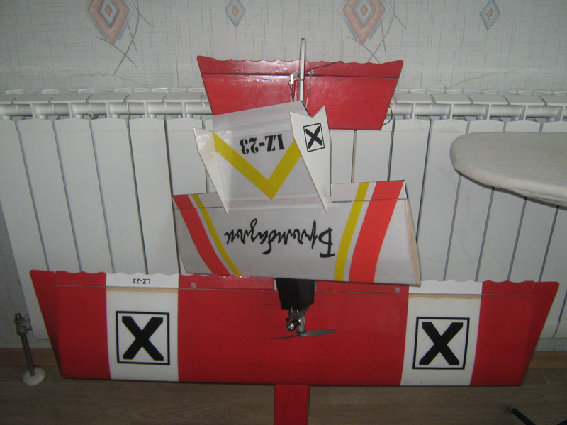 Общото време за изработка на модела не надхвърли 10-12 часа. Конструкцията е толкова елементарна че няма нужда от много обяснение. Крилото е два слоя 3мм депрон с надлъжник 3х16мм от липа. Крилото няма ребра, само депрона е огънат около надлъжника който е залепен на около 1/3 от ширината на крилото. Тялото е кутийка от 3мм депрон с усилващи надлъжници от 3х3мм балса, моторно ребро от 3мм шпертплат. Стабилизаторите - 3мм депрон обкантени с 3мм балса. Вертикалните стабилизатори са облечени и със копирна хартия с разредено Ц-200. Целия модел е облечен с фолио от ламинатор. Управлението се състои от две стандартни 9 гр серво машинки, приемник, индикатор за напрежението на бордовата батерия и батерия 4 клетки 170 мА NiCD. Оказа се че е предостатъчна за почти един час работа.