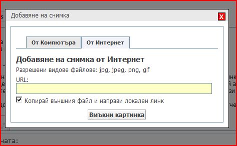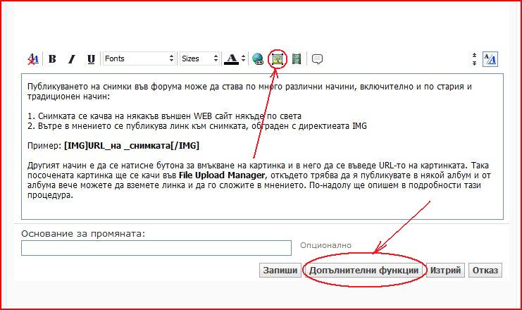 Другият начин е да се натисне бутона за вмъкване на картинка и в него да се въведе URL-то на картинката. Така посочената картинка ще се качи във File Upload Manager, откъдето трябва да я публикувате в някой албум и от албума вече можете да вземете линка и да го сложите в мнението. По-надолу ще опишем в подробности тази процедура.