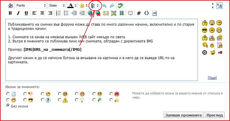 На този втори ред с икони се намира и другата важна иконка - кламерчето. С него се управляват снимките и файловете, прикачени към това мнение като приложения. С това кламерче се стартира и File Upload Manager.