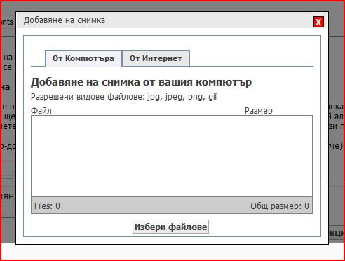 Ако извикате File Upload Manager от някой албум, този прозорец е празен и в него трябва да добавите снимки или файлове, които искате ДА СЕ ДОБАВЯТ към албума.