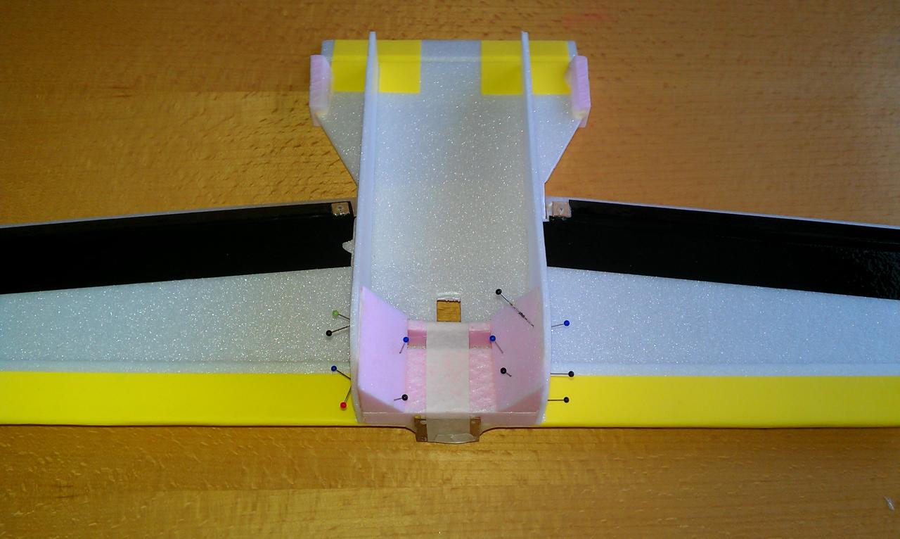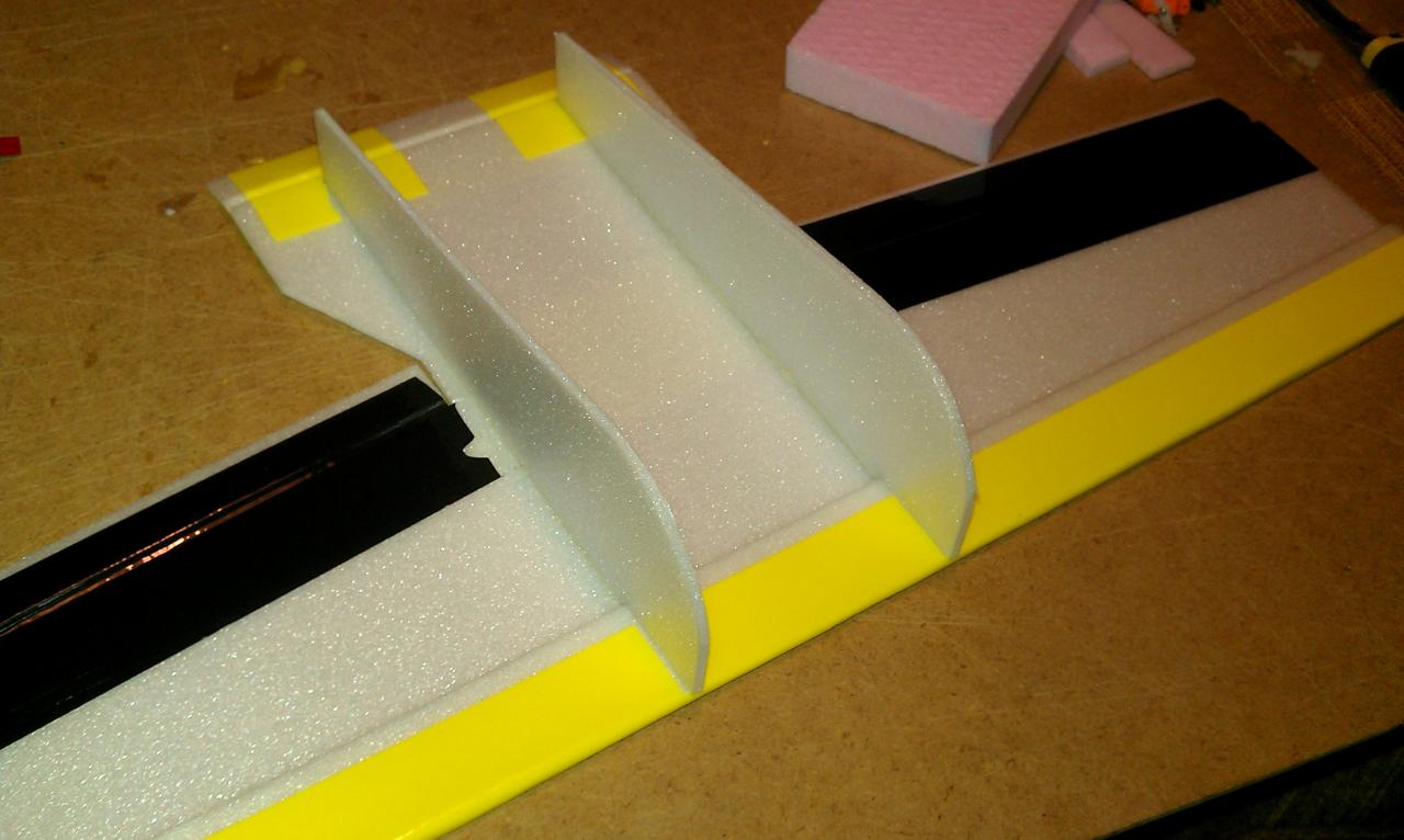 Да спомена, че крилото е с пръчка фибро стъкло по атакуващия ръб и в средата с карбонова тръба Ф3мм. Наистина стана здраво - доказаха го многобройните забивки преди корекциите!