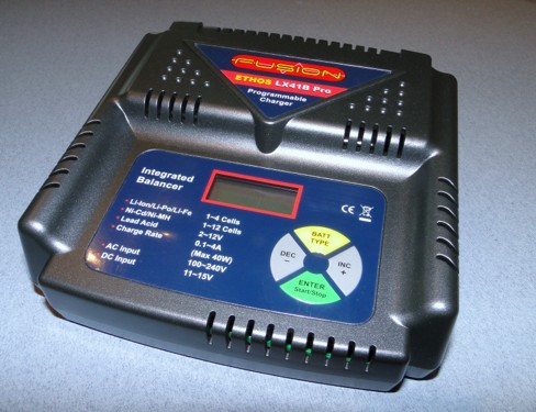 O-FS-LX41BP Fusion LX41B Pro Ethos AC/DC Features Built-in intelligent balancing circuit is designed to individually balance each cell on a lithium battery pack within the tolerance of 5mV during charge. Balancing plug adaptor boards are supplied to suit FlightPower, Thunder Power and JST-XH batteries. Optional adaptors for Polyquest & 4/2mm plug car packs are available. 2 line, 8 character, LCD makes the screen clear and legible. Monitoring features allow the monitoring of capacity, peak voltage and individual cell voltages (Lithium only) on the screen during and after charging. Various warning messages for incorrect input voltage, wrong connections, unsuitable battery condition and reverse polarity on output. Specifications Input Voltage: 11~15V DC, 100V~240V AC / 50~60Hz Battery Type & Cells: 1~4 Li-Po, Li-Ion, Li-Fe / 1~12 NiCd, NiMH Charge Rate: 0.1A ~ 4.0A Adjustable in 100mA steps (Max 40W) Trickle Charge Rate: 0 ~ 100mA (Ni-Cd & Ni-MH Only) Balancing Max.: Current 120mA (Tolerance 5mV during charge) Charge Termination: 'Zero Delta V' peak detection for NiCd/NiMH 'Constant current / constand voltage' for Li-Ion/Li-Po/Li-Fe Delta Peak Sensitivity: 8mV for NiCd & 5mV for NiMH (per cell)
