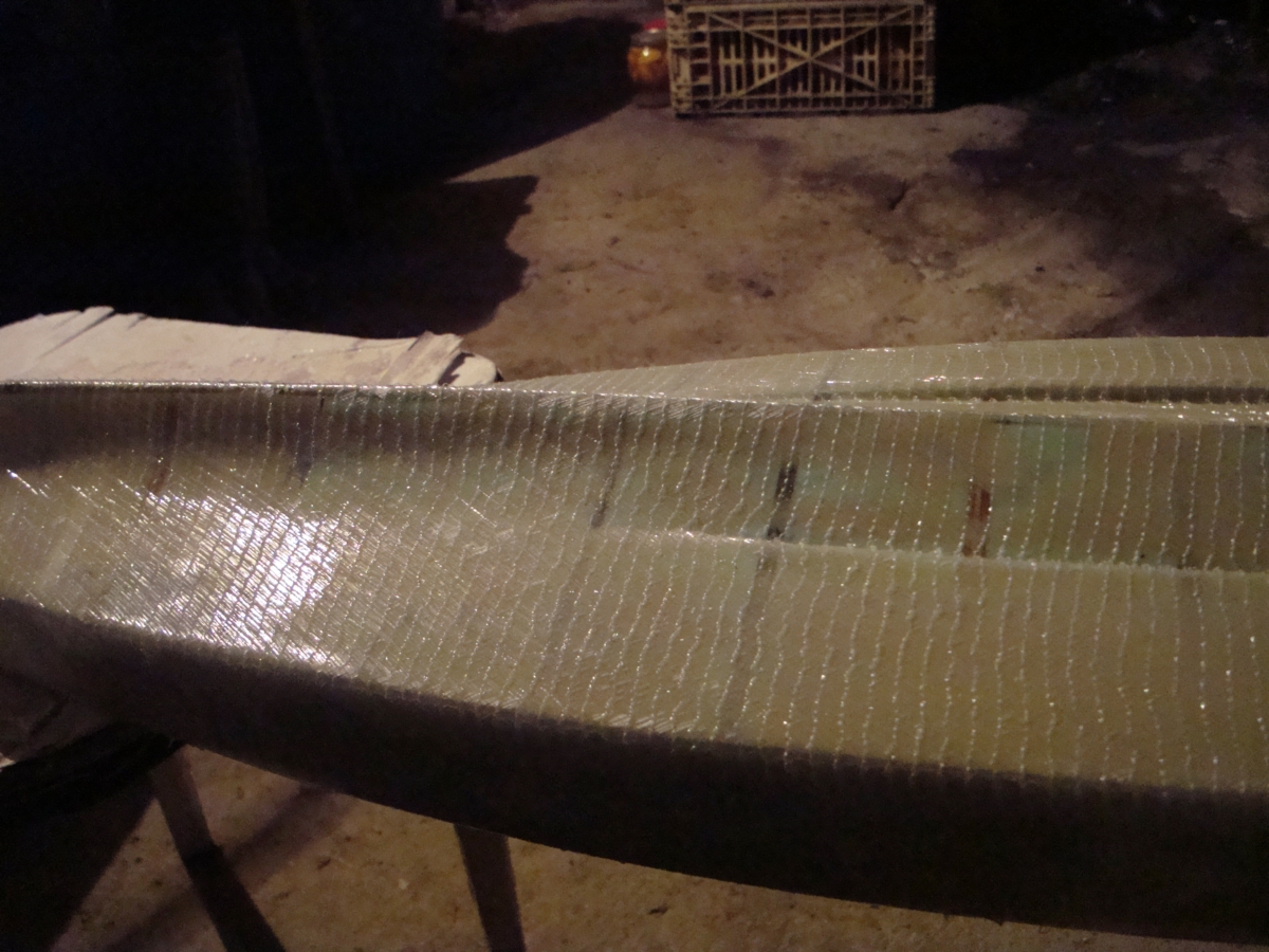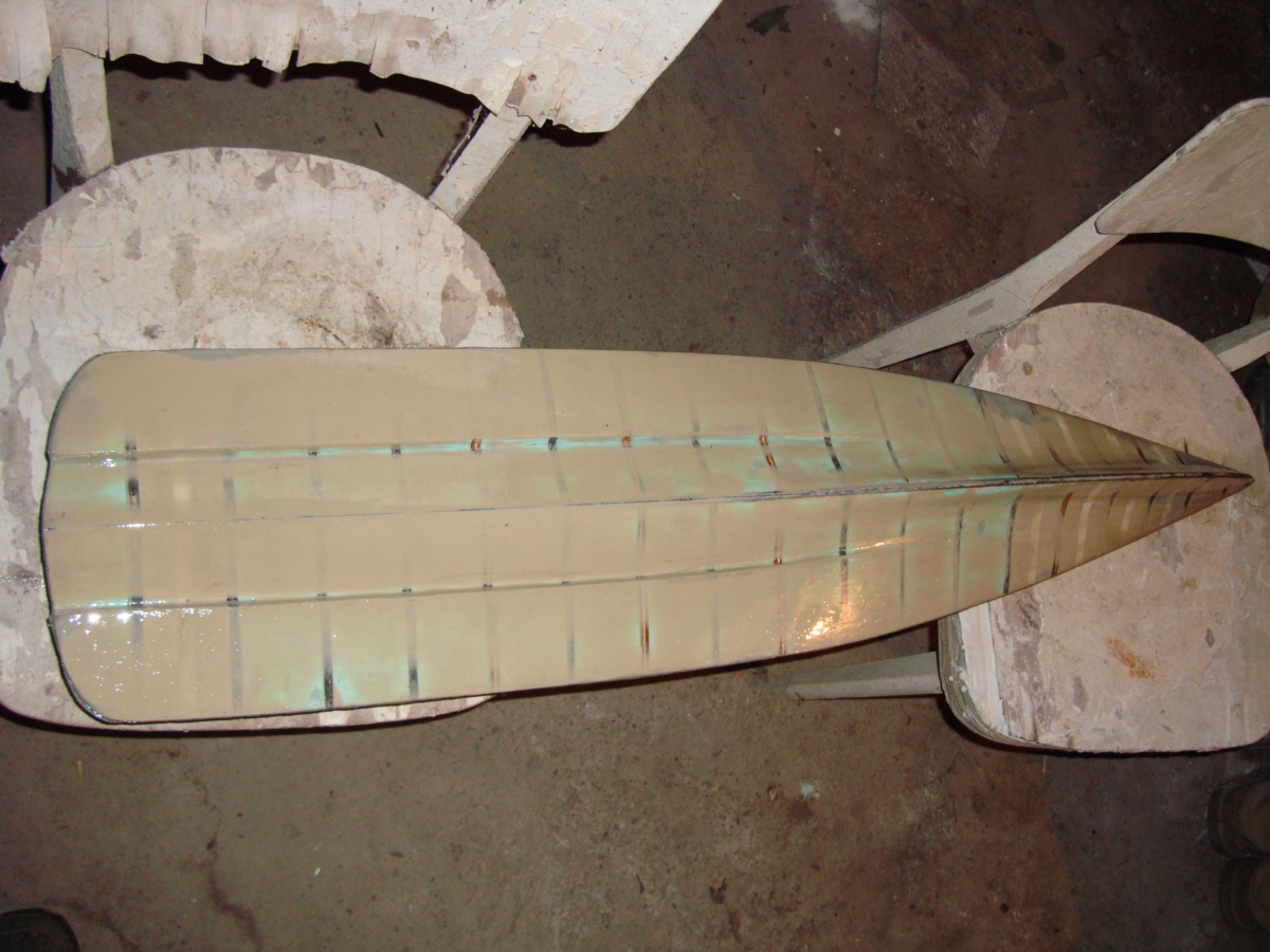 Покрил съм модела с прахов мат 150г/кв.м и епоксидна смола Летоксит 227. Все още не съм решил дали да ламинирам и дъното. Там кита е в повечко и е кораво, а и мисля, че се получи добре формата и почти няма нужда от повече работа. Страните обаче ще ги попроменя, особено в зоната около носа, защото при сегашната форма не съм 100% сигурен дали модела ще се отдели както трябва от матрицата. На по-долната снимка се вижда частично изшкурената горна част на модела и непокритото дъно. Най-вероятно ще обмажа цялата повърхност на модела със смола, оцветител и тиксотроп, за да имам стабилна и що-годе гладка основа за по-нататъшното полиране, както и за да мога да следя докъде да шкуря.