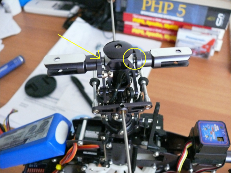 Вътрешните лагерчета бяха на място, но явно съм загубил 2-те втулки, без които при монтиране на оста се появява един 6 милиметров луфт, което е недопостимо. Както е показано на снимката се опитах да заменя оригиналните втулки с най-обикновенни шайби. Лошото е, че шайбите контактуват директно с повърността на главата и триенето е сравнително по-голямо. За момента не мога да намеря друго решение и ще летя така.