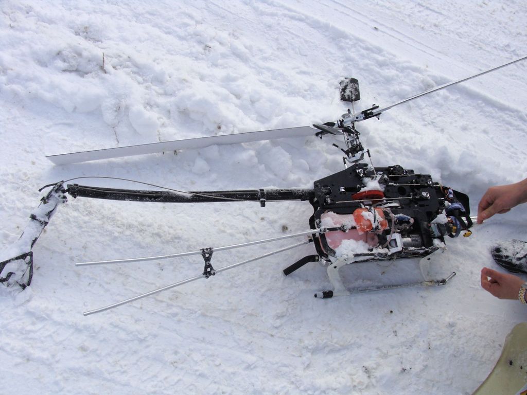 Междувременно имаше и една невероятна случка, от която за съжаление нямам нито снимка, нито клип. Докато се борехме със запалването на един форд, Димитър Илиев извади хеликоптера си и реши да врътне едно-две кръгчета на паркинга до хотела. Доста смело решение предвид факта, че свободното за полети място беше куб с размери 10х10 метра и ние щъкахме в това пространство. И както и се очакваше, полета завърши с удар на лопатите в клоните на едно дърво. И тука всъщност беше чудото - разхвърчаха се сняг, клонки и трески, но хеликоптера остана здрав и Митака безпогрешно го приземи. И разбира се получи овациите на всички за чудесното изпълнение. А на хеликоптера му нямаше нищо. Нямаше дори и следи по лопатите - явно бяха маркови и много здрави.