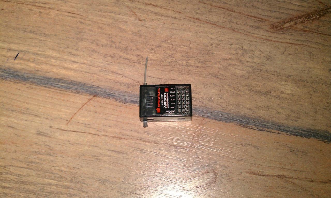 Приемникът, който ще ползваме е Спектрум... само дето е без антена:laughing:. Първоначално си мислихме, че това ще е проблем, но след като направихме няколко тестове, разбрахме, че няма за какво да са тревожим:wink:. Очевидно е, че с Антоан имахме проблеми при спойките, даже се вижда, че при буксата за батерията сме имали разтапяне, но поне при мотора и СК се се получи чудесно. Като цяло не се справихме особено добре, обаче така е като бързаме:nono:. Другият път - по-добре:wink:.