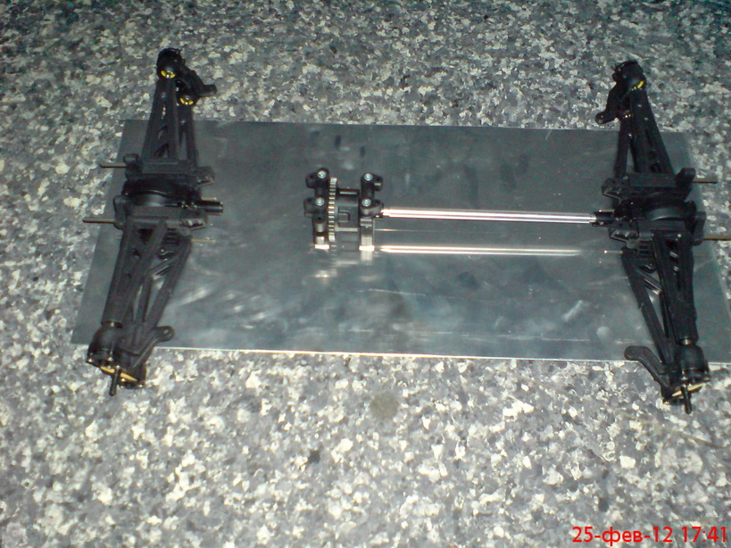 От доста време ме гложди идеята за малко по голяма играчка от тази която имам.Гледам цените им и цъкам като руски часовник.Покрай камиончето което имам събрах доста чаркове за резерва , но то излезе доста здраво.И за да не ги гледам че стоят безучастно реших да сглобя нещо средно между 1/10 и 1/8. За шаси ще ползвам алуминиева ламарина 1,5 мм.След окончателното сглобяване ще изрежа още една за заздравяване.Моделчето ще бъде 4х4 с централен диференциал.Още се триумя дали да преместя централния от другата страна на шасито с цел увеличаване на проходимостта или да го направя по стандартния начин.Все пак от това създание няма да търся скорост.