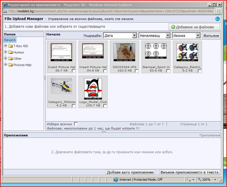 Отдолу има трети прозорец, в който провлачвате тези снимки, които искате да прикачите към текущото мнение. Прикачането става с един от двата бутона долу вдясно. За да видите прикачените файлове, трябва да затворите прозореца на мениджъра, да се върнете в мнението и отново да натиснете кламерчето.