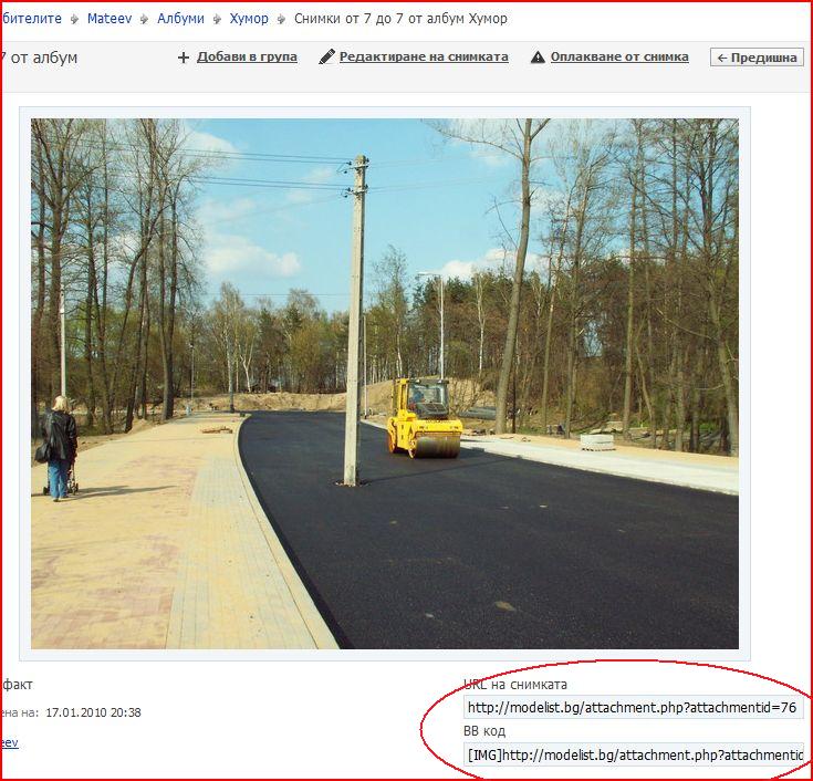 Долу в дясно под снимката се намират хиперлинковете, които можете да копирате и след това да ги вмъкнете в един или в повече постинги. Хиперлинка всъщност е един, но в два различни формата. Горния е самият хиперлинк, а долния - същия хиперлинк, но обграден от двете страни с директивата [IMG]. Вие трябва да копирате долния линк и директно да го изсипете в мнението, което пишете.