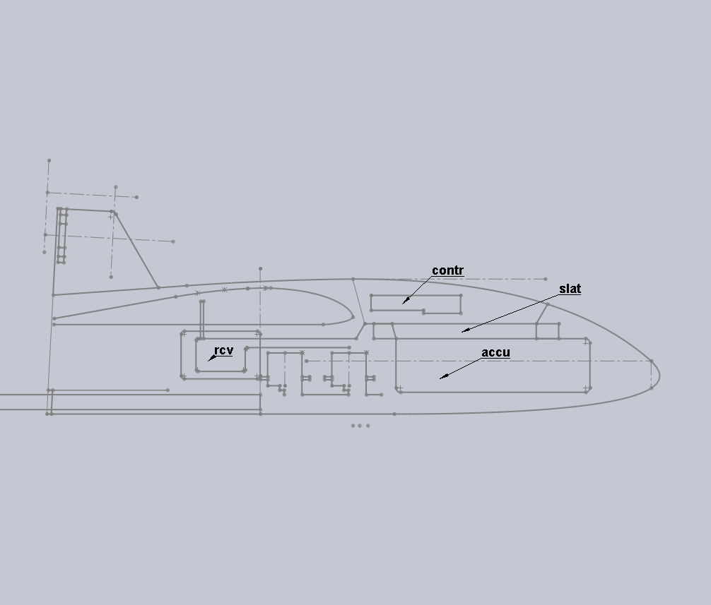 Посочил съм местата на акумулатора ( 1800mAh 3S ), приемника ( по-големия контур е капаче за достъп до приемника ), машинките ( 9 грамови ) и контролера. Късата антена е нагоре, а дългата - надолу и напред...мисля да я изведа по долната част на кабината, напред, скрита в шлаух.