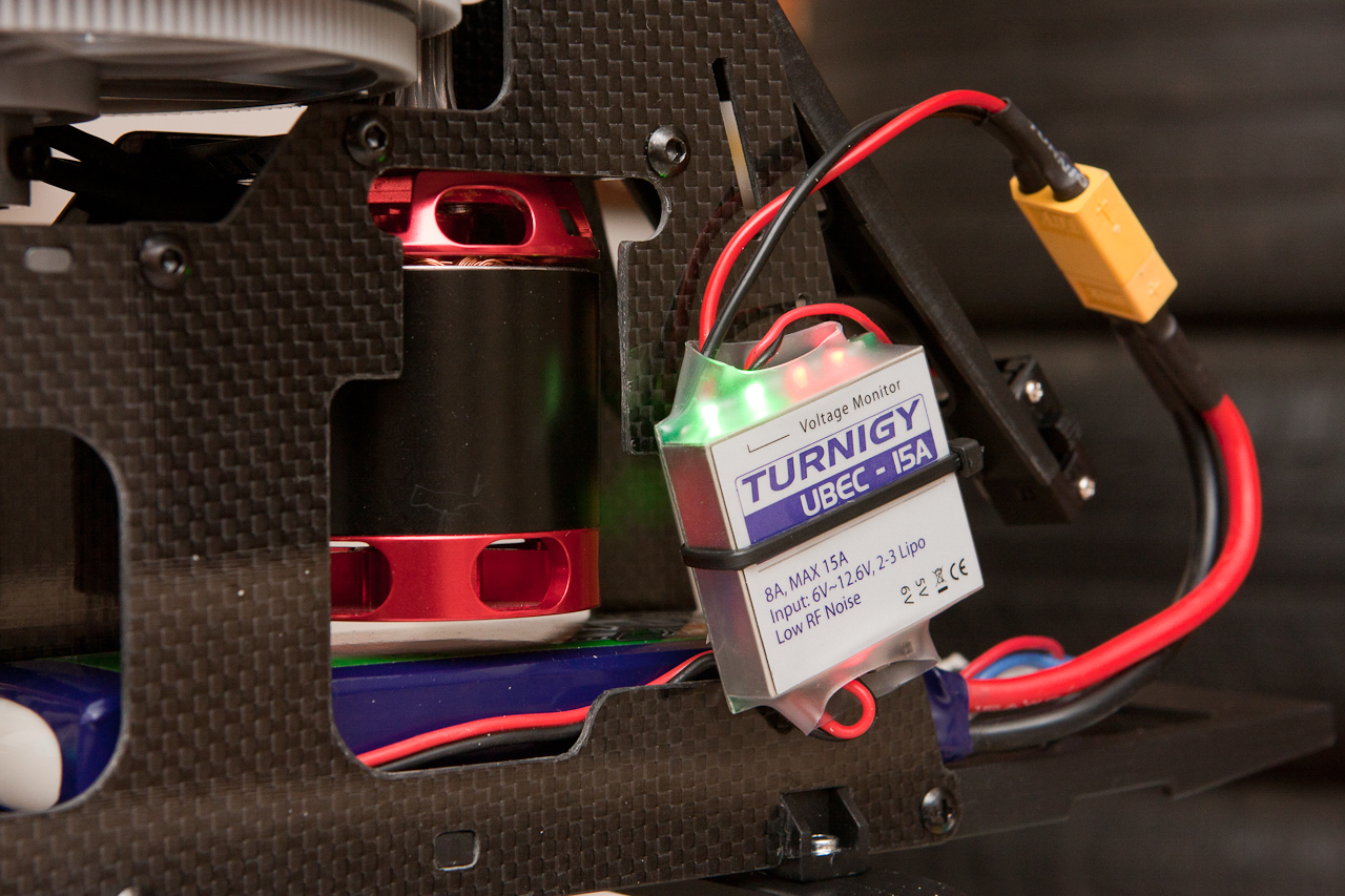 Тук съм прорязал отвор в карбоновата рамка, за да мине двигателят. Разрезът е 33мм широк. Монтирах и BEC-a (Turnigy 8-15A) там, за да е възможно най-далеч от приемника (както пише навсякъде) и за да може да се охлажда от струята създадена от двигателя. Половината BEC от зад е открит от фабричен отвор в рамката към двигателя. Още мисля къде точно да монтирам ключът.