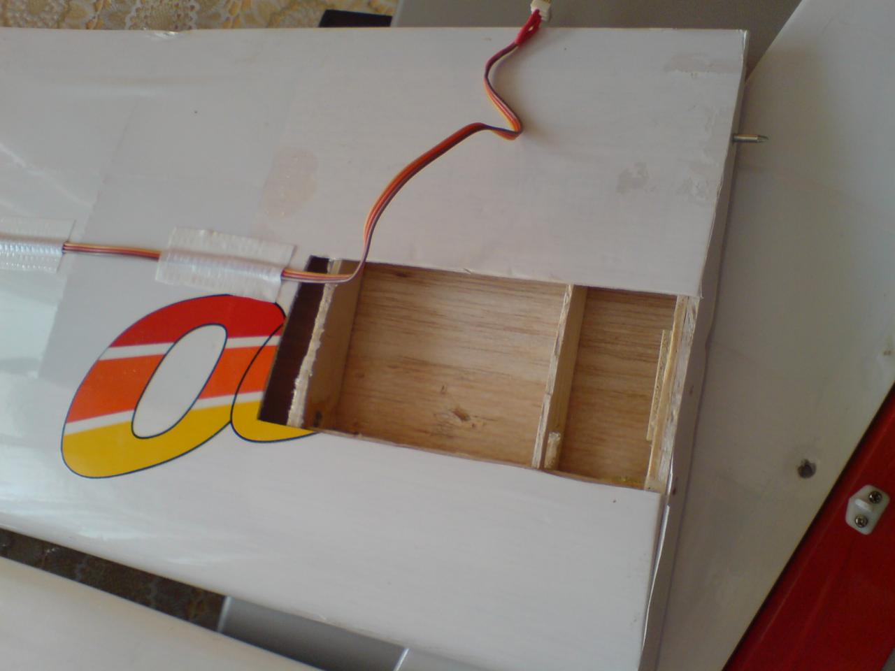 Крилата - и двете са със сервомашинки 9гр. и елерони. Едното крило ( вижда се на снимката е без тръбичката, през която се носи крилото. Счупи се при последния полет....много тънкостенна месингова, но на крилото му няма нищо.