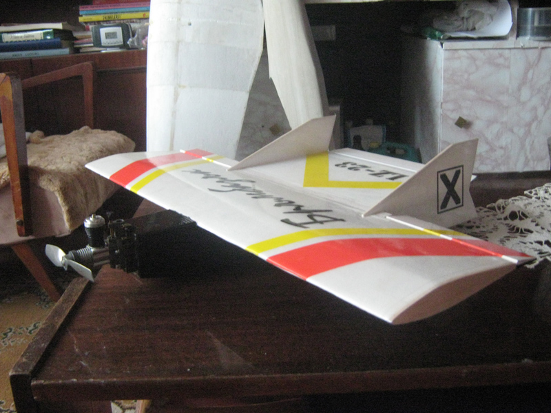 Това е първото отроче на Чепатата тояга. Естествено изцяло от 3мм депрон. 2 канала за управление. 580мм размах, 315 гр полетно тегло.