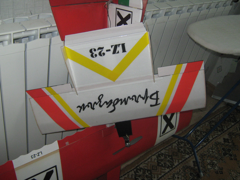 Общото време за изработка на модела не надхвърли 10-12 часа. Конструкцията е толкова елементарна че няма нужда от много обяснение. Крилото е два слоя 3мм депрон с надлъжник 3х16мм от липа. Крилото няма ребра, само депрона е огънат около надлъжника който е залепен на около 1/3 от ширината на крилото. Тялото е кутийка от 3мм депрон с усилващи надлъжници от 3х3мм балса, моторно ребро от 3мм шпертплат. Стабилизаторите - 3мм депрон обкантени с 3мм балса. Вертикалните стабилизатори са облечени и със копирна хартия с разредено Ц-200. Целия модел е облечен с фолио от ламинатор. Управлението се състои от две стандартни 9 гр серво машинки, приемник, индикатор за напрежението на бордовата батерия и батерия 4 клетки 170 мА NiCD. Оказа се че е предостатъчна за почти един час работа.