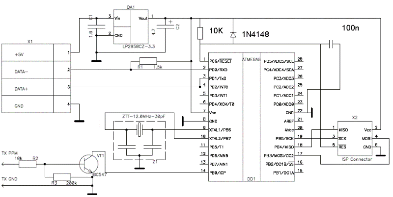 Повода за тази тема е че преди няколко седмици си направих подобен кабел.След като направих десетина часа на AEROFLI и се убедих че кабела работи безотказно реших че трябва да го споделя.Всичко започна с това че си купих кит на хели TZ-50, и идеята че трябва да симулирам малко литкане с хеликоптер на симулатор.Търсенето на схемно решение из българския нет не даде никакъв резултат.На въпросите ми за схема ми отговаряха че е по лесно да си го купя вместо да си губя времето, което ме амбицира още повече че трябва сам да си го направя защото не си падам много купешки моделист.Верно е че загубих около три дена да се ровя из нета но както знаем при братята руснаци има всичко.След като намерих схемата и .Hex файла се оказа че не мога да намеря подходяща платка която да е с минимални размери,по руския нет се мотат няколко платки но всичките който успях да намеря са за големи елементи в стандартен DIP корпус което налага използването на кутиика за тях.Това не ми хареса да се мандахерца някаква кутиика по кабела затова набързо си проектирах една платка която да е с минимални размери и за SMD елементи, платката се получи с размер 14х40мм и затова само я омотах с тиксо и почти не личи че на кабела има сложена и електроника..Схемното решение е реализирано с микроконтролер на Атмел ATMega8, като си има драивер за вина които да се разпознава като обикновен джоистик и от контрол панела да може да се вижда и да се калибрира при нужда.Входния сигнал трябва да е РРМ и се взима или от стандартната букса която е отзад на всяко едно радиоуправление , или се намира със осцилоскоп на едно от крачетата на чипа които е на самата платка на радиуправлението, или от едното краче на кварца-кой от където го намери,най-лесно е разбира се от буксата за тренер-ученик. Качвам снимки така че да може да се повтори от всеки лесно и бързо без да се губи излишно време за ненужно сърфиране из чуждестранския нет.Нех фаила не знам как да го кача защото не взима .рар фаилове...