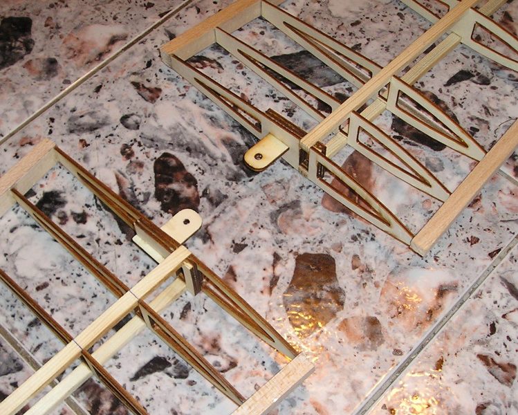 Продължавам с двете полукрила, каквото направя по едното веднага след това повтарям и на другото полукрило за да станат горе доле едновременно и двете. След възела за закрепването им идва ред на усилването на лонжерона. Това усилване го правя с балса 2мм дебела с вертикално разположени нишки. При натоварване двата лонжерона работят единия на опън другия на натиск-тоест те трябва да стоят идеално прави и да не се гънат-поради тази причина лепя тази балса с вертикално разположени нишки така че да ги държи винаги успоредни един на друг и идеално прави. Получава се кутиобразен лонжерон тип кесон със правоъгълно сечение. Двата силови лонжерона ми са борови летвички със сечение 9х5мм. Нарочно реших да използвам доста по дебели летвички от колкото е нужно при нормален модел, за да получа и доста повече здравина на крилото като цяло.Тази здравина ми трябва защото модела е за всеки ден, за пилотаж и за три де, което значи че ще вижда много зор във въздуха от всякакви видове претоварвания. Затова реших да се подсигуря от всякъде доколкото мога в границите на разумното. Разбира се тази здравина ще я получа за сметка на по-голямото тегло, но тъи като тялото ми се получи доста по леко спрямо предварителния разчет реших че тука мога да си го позволя това тегло и тази здравина.