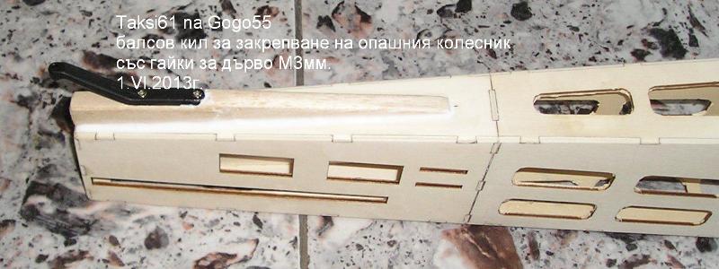 След укрепването на тялото се усетих че не съм монтирал опашния колесник и веднага поправих тази грешка. Използвах пак балса с дебелина 10мм., височина 20мм., и дължина на око някъде 20см. като в нея със две гайки за дърво М3 и два болта М3х20 закрепих и планката на опашния колесник. Залепих това балсово трупче в задната долна част част на тялото. Нарочно съм толкова подробен в тази тема и давам такива подробни обяснения който сигурно са повече от ясни за хората който са напред в моделизма, но за някои от старите теми съм получавал много въпроси еи такива, защо, и как аджеба, та затова тука пиша възможно най-подробно всяко едно свое действие.