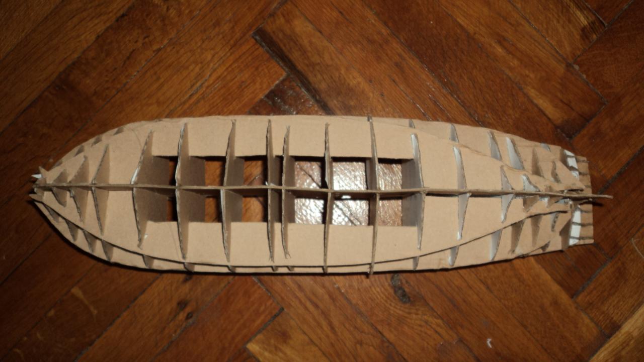 Много лошо брат.Да беше ползвал фазер или шперплат.Аз съм нов но въобще няма да има стабилност-да не говорим за усукване на модела.Просто основата ти е калпава и шпангоутите и те с картон-леле мале.