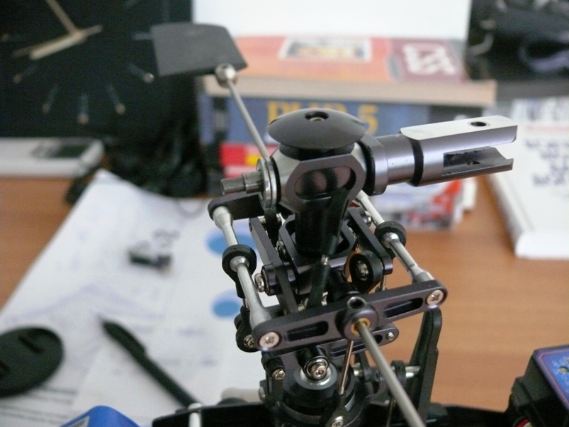Вътрешните лагерчета бяха на място, но явно съм загубил 2-те втулки, без които при монтиране на оста се появява един 6 милиметров луфт, което е недопостимо. Както е показано на снимката се опитах да заменя оригиналните втулки с най-обикновенни шайби. Лошото е, че шайбите контактуват директно с повърността на главата и триенето е сравнително по-голямо. За момента не мога да намеря друго решение и ще летя така.