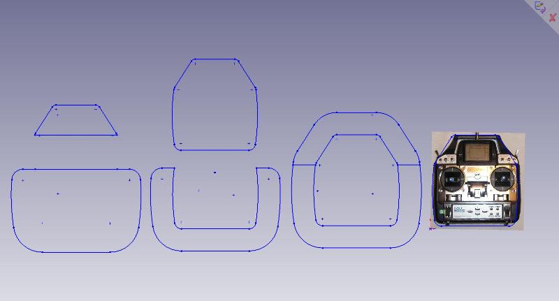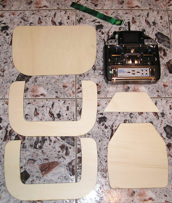 Поредната екстра която си направих е поставка за радиоуправлението. Реших да направя тази поставка за да си подпирам дланите на нея докато литкам, защото след пети шести полет освен че врата ме заболяваше, то и ръцете ми се уморяваха да ги държа все под напрежение, а самото радиоуправление е малко и не ставаше да си ги подпирам на него и в същото време да движа и двата джоя. Тъй като имам две санви начертах и нарязах по техен размер тази поставка. Това което се получи ми е удобно и мисля че ръцете няма да ми умаляват при повече на брои и по дълги полети, но ще видим във времето. За сега това е пробен тестов вариант и няма да се мъча да му придавам външен вид, а след 10-20 полета ако се докаже че найстина ми е удобно и върши работа ще помисля за външния вид. Като най лесен и бърз вариант мисля че ако се облече с един, или два слоя стъклоплат и смола и после се пръсне с подходяща боя ще стане добре. Може и с някаква кожа и тънък дунапрен да го тапицирам, но това в бъдеще време ще реша кой вариант ще е най подходящ и на кой ще се спря. Ако някои иска корелския фаил за рязането на лазер за да си го повтори да ми пише и ще му го изпратя, че форума не взима нито зип нито корел.
