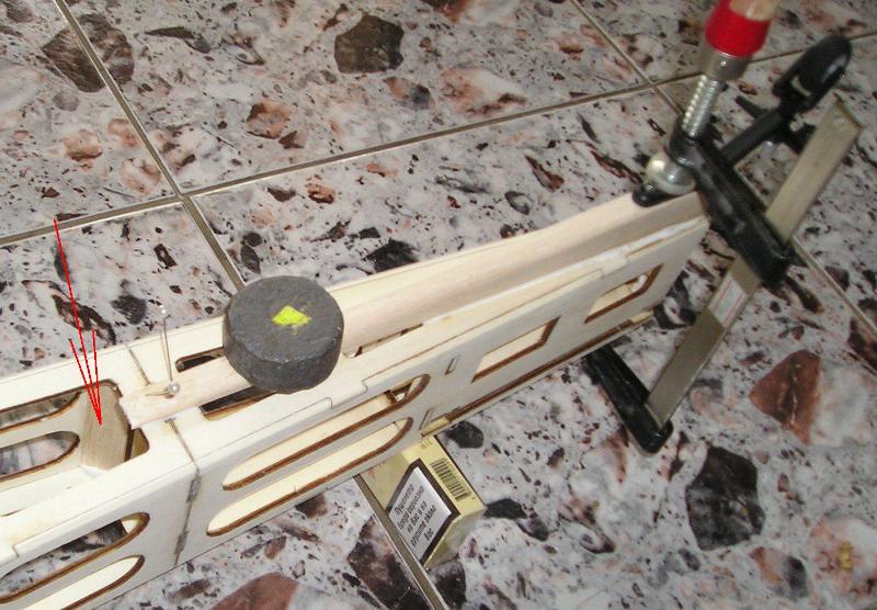 Преди да облеча тялото със фолио подсилих слепките между четирите части на тялото. Използвах балса със триъгълно сечение-първо режа квадрат10х10 от балсата, после с макетното ножче по диагонала го срязвам по цялата му дължина. Тези парченца после залепих към напречно ребро и страница-отбелязал съм с червена стрелка на снимката. После залепих и кила с монтиран на него опашен колесник, в кила предварително залепих гайки за дърво М3мм. за болтовете на опашния колесник.