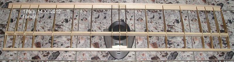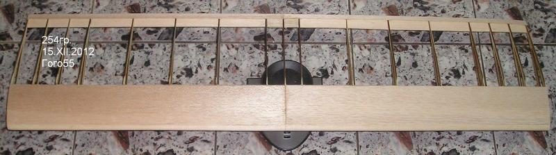 След кабината идва ред на крилото. Профила е Е-205 с дебелина от 10,48% и хорда от 350мм. Изработката е по класическата технология от време оно, нервюри от шперплат 3мм., лонжерони от бор, и атакуващ и изходящ ръб от балса.То ще бъде от три части, центроплан 120см., и две полукрила по 60см. всяко, като цялото крило идва с обща разпереност от 240см. Полукрилата ще се закрепват към центроплана със силов лонжерон под ъгъл от 3 до 7 градуса, или без ъгъл така че да може да се получи и нацяло право крило , както и крило тип \________/ според настроението ми, и това което искам като напречна стабилност от модела. Изработката е видна от снимките.