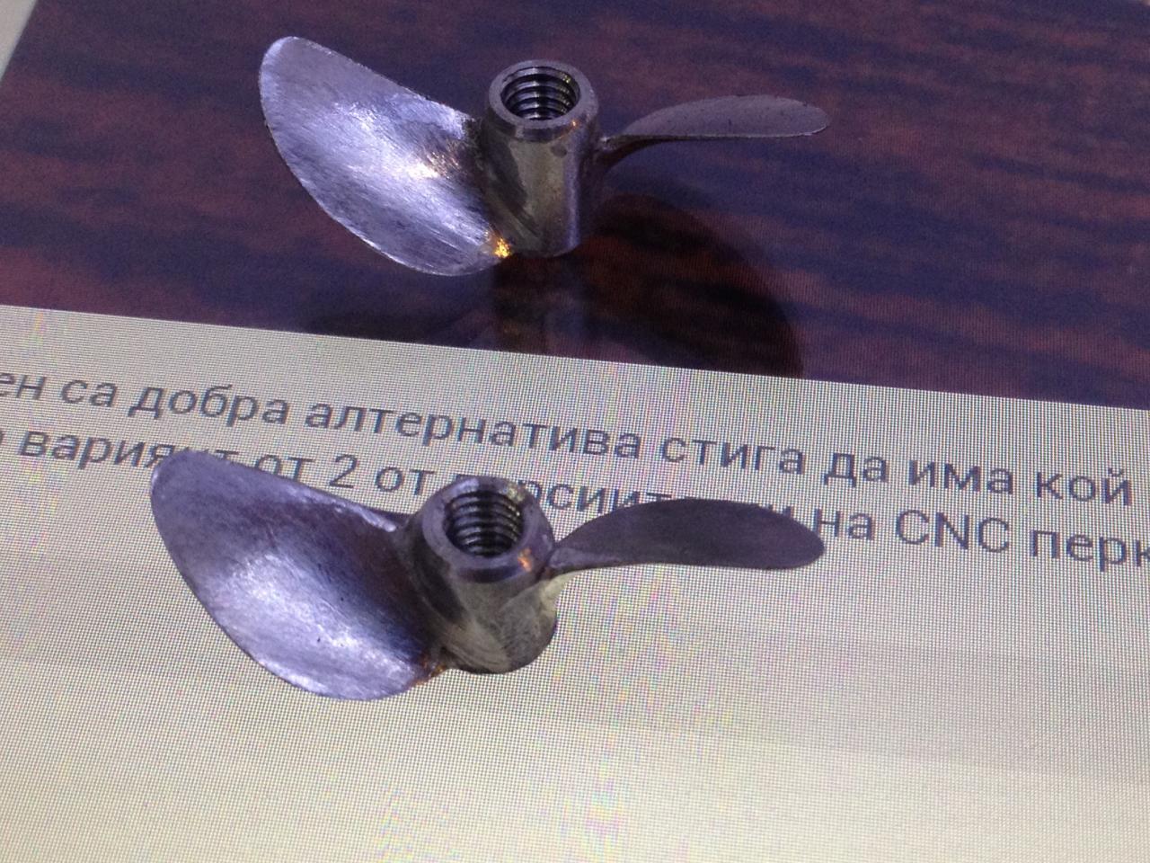 В инерес на истината най-доби винтове са ми се получавали от заготовките на Граупнер. От Евгени съм ги вземал. За съжаление от 5 перки 3 са криви. Само с пиличка, шублер и много любов съм получавал отлични винтове. Прописнах 6-7 часа за винт.