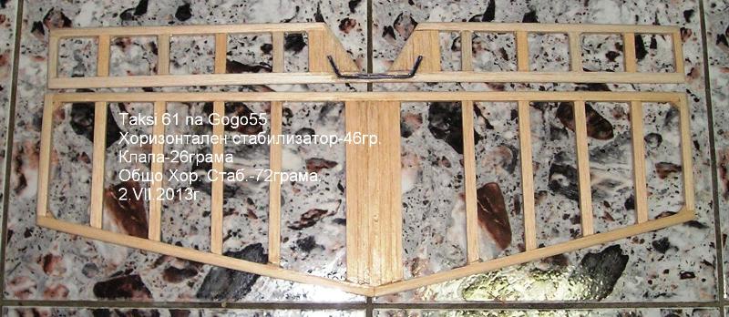 След няколко дневно затишие отдаден на полети и мързелуване се върнах пак на Таксито. Направих днес хоризонталния стабилизатор, неговите мярки и пропорции съм описал в мнение 6 от първа страница на темата, когато още мислих размерите, и чертаех модела на 3D чертеж. И тук се полакомих малко обаче за увеличаване на размерите, и го пуснах с по 10-20мм. по-голям, колкото е ширината на една летва балса.Клапата също я увеличих от 55 на 60мм да е ширината и. Целия хоризонтален стабилизатор направих от летви балса със сечение 10х8мм., като дебелината му е 8мм. Отиде около половин пластанина балса 10х100х1000мм., или около 6 летви със сечение 10х8мм. Летвичките балса рязах от голямата пластина със резачката за балса описана в тази тема:
