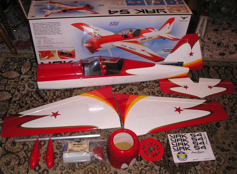 Поредното попълнение в моята малка ескадрила-15 номер по ред е ЯК-54 балсово шперплатов кит с разпереност от 145см., за двг 7,5 или 8,5куб. или в краен случаи за електро мотор. Кашона пристигна тази сутрин, но цял ден по задачи не можах да го отворя за да се порадвам. Сега обаче вечерта извадих квото имаше в кашона и претеглих за да знам горе доле какво тегло ще има, и от там да си направя сметката как да събирам и как ще лети.