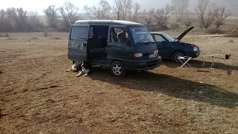 Една интересна снимка от днескашните полети. Виждат се два самолета, но единия е истински, а другия е модел. На другата снимка колата на моделиста-тоест моето малко 7 местно бусче 4х4, идеално за всякакви модели, както и за планина, излети, рибарлък и прочие където е нужно малко повече вместимост, и малко повече проходимост.