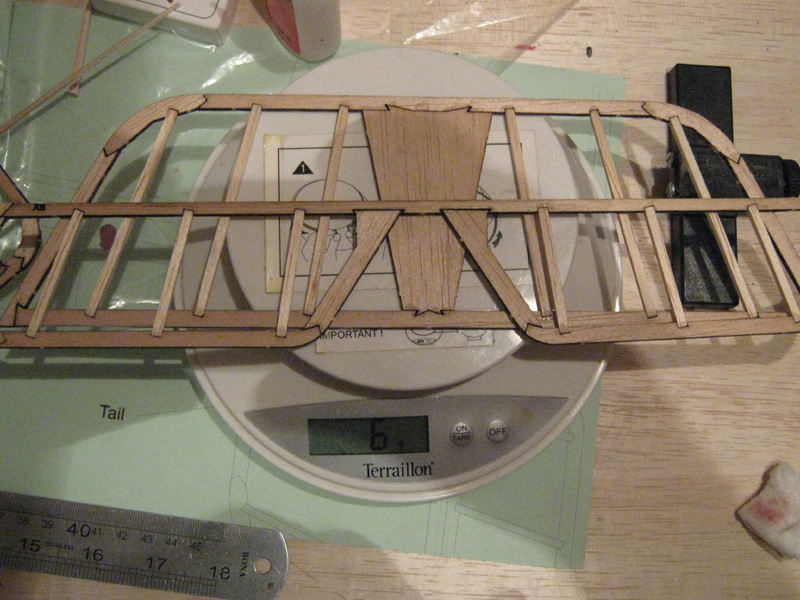 След няколко часа се получи следния резултат. Когато имах малко време успях да налепя и стабилизаторите. На снимките се вижда теглото на отделните компоненти. Този вариант е безспорно изключително бърз за сглобяване и много лесен, но за сметка на теглото.