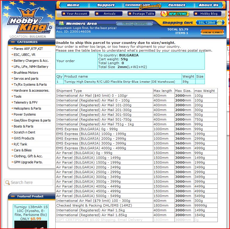 Ако Hobby King знаеха, че България е в Евросъюза, щяха да си направят труда да въведат таблицата на транспорта от Германия до България и визарда щеше да продължи. В момента според мене това е една грешка от недоглеждане, и понеже българите сме овце и никой не се обажда, ситуацията така и ще си остане.