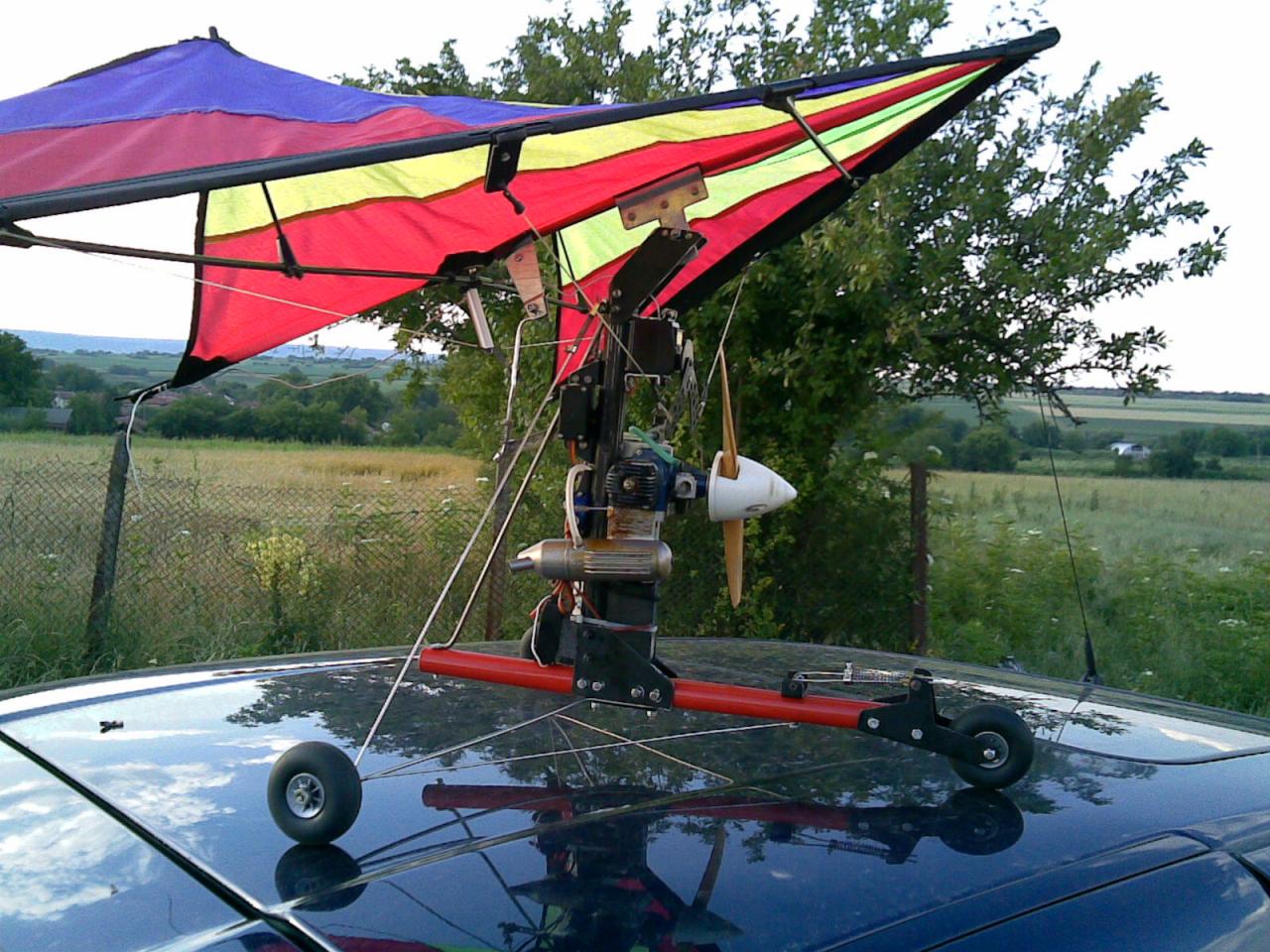 За ъгъла на мотора, работата е много относителна при теб понеже конструкцията/от това което виждам на снимката/ е малко опростена.Мотора трябва да има ъгал 3-4 градуса надолу, за да не прави така наречения "мах" количката, но по важно е да центроваш самата количка и тогава да търсиш центъра на крилото.Това става по следния начин: