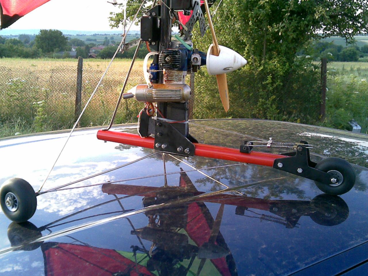 За ъгъла на мотора, работата е много относителна при теб понеже конструкцията/от това което виждам на снимката/ е малко опростена.Мотора трябва да има ъгал 3-4 градуса надолу, за да не прави така наречения "мах" количката, но по важно е да центроваш самата количка и тогава да търсиш центъра на крилото.Това става по следния начин: