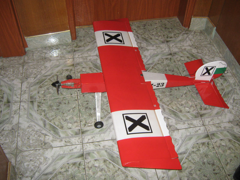 Целия модел е облечен с оцветено и прозрачно фолио за ламинатор. Оцветил съм само участъците в червно, белите са облечени с прозрачно фолио. Естествено оригиналния модел е имитация на немски самолет от първата световна война, но понеже сме си българи, реших че може да си сложа нашите знаци на спортен модел. Като цяло визията на модела ми допада. От долната страна е изцяло бял със същите отличителни знаци. Теглото на модела – 1013 гр., от тях теглото на планера е 470 гр.