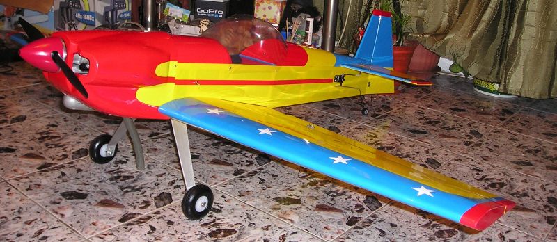 Първи полет/облитане/-леко рулиране по пистата видях че завива добре и е послушен, проверка на кормилата и засилка лека по лека за да видя как ще се държи по време на засилката.Права посока държи, видях че е нормално всичко, и по средата на пистата някъде на 7 -8 метър дадох максимална газ, към края на пистата на около 15 метър отлепи от земята, задържах го ниско доло на около 40-50см. височина, така че гумите почти да се допират до връхчетата на тревата, успореден на земята за да набере скорост още около 10-15 метра. После когато имах достатъчно хоризонтална скорост поне едно 40-50км/час дадох плавно горна команда и тои се изтреля рязко нагоре в небето.Управленията на максимален ход, и без експонента ми идват големи в някои случаи като този.След като дигнах около 40 метра височина го тримирах искаше леко елерон на дясно и леко кормилото за височина надоло по две три натискания на бутоните за тримуване защото катереше при пуснати ръчки и кренеше на ляво.Намалих ходовете на управленията на половина и започнах да си литкам съвсем спокойно.Няколко минути си играх на плавни леви и десни завои с набор, или загуба на височина за да му свикна използвайки и трито управления едновременно.Лети идеално, както го оставя така продължава, няма никакви стремежи да си променя курса без значение в какво положение е спрямо земята, дали е с крен или с набор на височина, просто пускам управленията и тои лети в същата посока като по релси без да я променя изобщо спрямо земята, и е много стабилен, не мърда дори с милиметър, поне с окото не се хваща да има някакви трептения, или промяна в курса. При рязки команди много рязко се подчинява и може би трябва да дам малко експонента на стиковете.По вертикала катери докато мога да го виждам като е много послушен на всичките кормила и не заваля настрани, значи че двигателя макар че не е разработен и дросела е ограничен с 2мм. преди максимална газ то му стига като мощност.Вертикалното кормило стига даже е повече от колкото ми трябва сега за първите полети.Кормилото за височина също ми стига на този етап, елероните също  с две думи кеф. Единственото нещо което ми пречеше при някои фигури беше много рязкото им изпълнение, но това ще го оправя от апаратурата като дам 5%-15% експонента на кормилата за височина и крен. Влиза и излиза от свредел без проблеми, както и от гръбен еднакво спрямо нормалния веднага и на мига. Лупинги с какъвто радиус си поискам-просто кеф.Тоно върти се супер, кефти бързо, кефти бавно, и не губи височина при това. Завойте малко са резки ако не внимавам, но с експонентата ще се оправят.Доволен съм от самолета защото е точно това което очаквах, и за което се бях приготвил психически, а и външния вид ми харесва с изключение на цветовете.Видео от полетите нямам защото ходих сам.