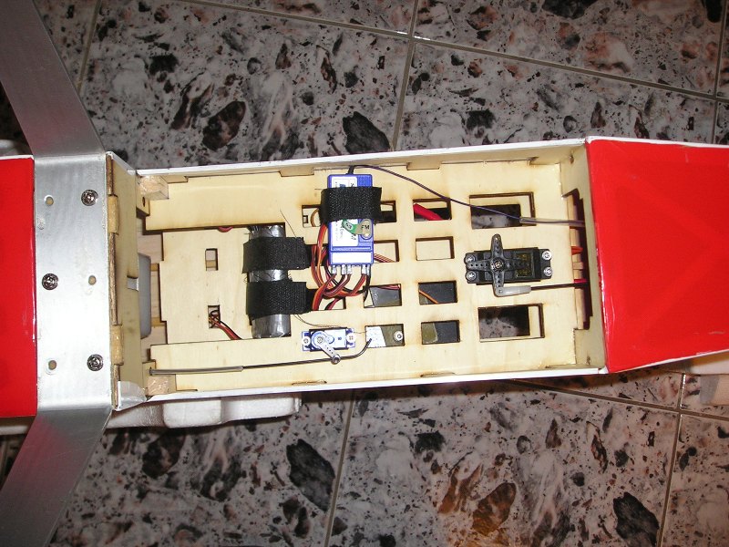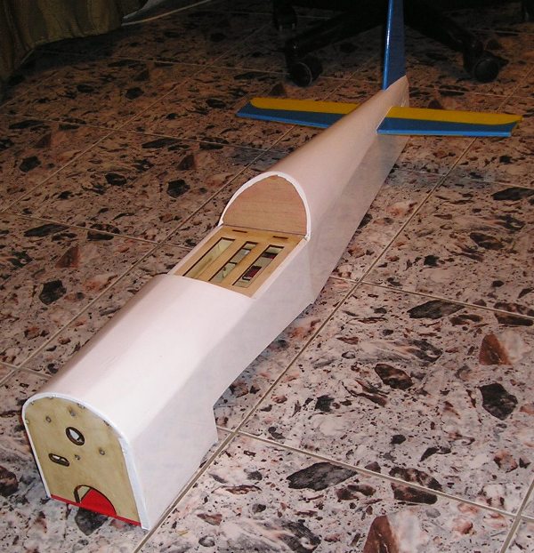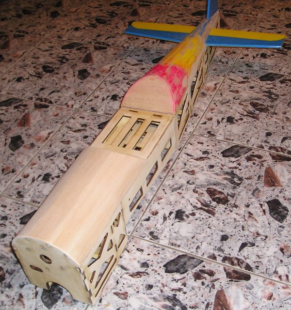 Залепих стария гаргрот над задната част на тялото зад кабината със старите хоризонтален и вертикален стабилизатор.Не ми се режеше и нов гаргрот щото е от стиропор облечен със балса, а нямах под ръка кантал. Оригинално тялото тежеше 560грама без хор. и верт. стаб, а това въпреки подсилванията и въпреки че е с 3мм шперплат е още на 480грама.Ще видим с пленката колко ще стане.