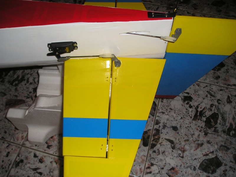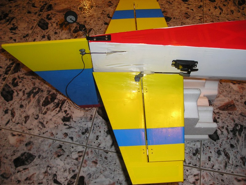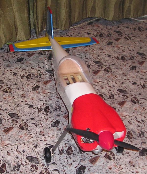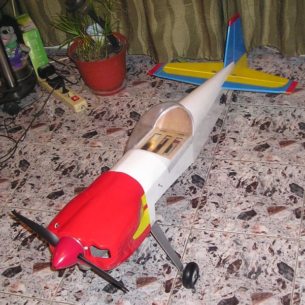Дам, оста на двигателя и челното ребро са си с ъгъл.Меря осевата линия която върви през целия самолет, почва от най-предната точка на вала на двигателя, има надлъжник там по цялата дължина на тялото и е на едно ниво с хоризонталния стабилизатор.Така двете хорди на хоризонтален стабилизатор и крило в момента са успоредни една на друга, но на различно ниво.Хордата на хоризонталния стаб е на осевата линия, а хордата на крилото е под защото е нископлощник този модел. Относно щипките на тягите -да, та са си оригиналните който идват в комплекта и нарочно не съм сложил силиконов или друг шлаух защото не съм видял до сега да се откачи такава щипка по време на полет/друг е въпросът ако щипките са разшлъондени и се откопчават лесно-при мене до сега нема такова нещо/.След като усвоя самолета, което усвояване е от направени поне 50 полета без проблеми и поне 30 пъти изпълняване на целия комплекс F3A пак без никъв краш или друг проблем тогава може да им сложа шлаух, или да ги заменя с ябълковидни съединения /имам ги налични/ но не ми се слагат още, защото не съм сигурен дали ще мина изцяло на якове поне два или три ЯКА в различни размери, или ще литкам и този модел успоредно с яковете.Така правя поне до сега и не съм имал проблеми. По време на полетите то едно по едно си идват разбира се някои си нещица които да се правят, или подменят. Иначе не е интересно само да се лети трябва и да се човърка чат пат и усвояването на самолета да става бавно и полека за да се насладя изцяло на него, а и за да ми мине целия през ръцете.Относно ауспуха ако е с главата надоло то трябва да режа красивия нос за да се покаже ауспуха извън него странично което ще е много по гадно за визията, така съм го резнал само от долната страна и е единствения възможен начин да се побере двигателя без да се реже отвор в носа отстрани. Ако виждаш някакви нередности по конструкцията казваи да ги оправям докато не съм облекъл тялото.