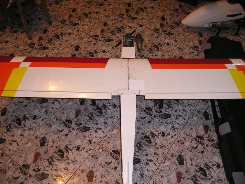Отдавна не бях писал тук защото просто нямаше какво да напиша, иначе всяка седмица полети по малко но нищо интересно, с изключение че вече два пъти не ходя сам на полянката ами идва и човек от Пловдив при мене да му облитам тренера и дет се вика покарах малко на "аванта" и чужд самолет. Сега ще покажа как съм моднал тренера си, мисля че може да е от полза за някои. Тои основно го ползвам за предаване на видео от въздуха и поради идеално правия си полет, и за сега ми е най добрия самолет за тази цел. При него проблема е че крилото му оригинално се закрепва с ластици към тялото.Тези ластици обаче често се късат от старост, а и трудно се намират. За целта като правих новото тяло описано някъде в началото на темата съм залепил пред крилото две парчета шперплат с отвори , а в самото крило към атакуващия ръб и лонжерона му дюбели който дюбели стърчат по 8-10мм пред атакуващия ръб така че да се намушкват в тези отвори.Отзад на изходящия ръб на крилото пак два отвора и със два болта към залепени бронзови втулки с резба към тялото.По този начин се избавих от ластиците при закрепването на крилото към тялото. Отпред където трябва да е стъклото нарочно е дупка, защото там в нея слагам видеокамерата. Вчера постигнах 4,2км обхват на видеото и мисля че скоро ще покрия и заветната граница към която се стремя от 10км., ама божа работа още се не знае нищо та не съм се похвалил в темата за телеметриите.
