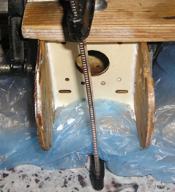 Тялото на хубавеца от горното мнение вече е слепено и готово за нови полети. Едната слепка миналия ден беше на хоризонталния стаб, втората слепка снощи на реброто за моторамата. Хоризонталния стабилизатор нямаше нужда от нови детайли и след слепването си стана като нов, не си личи че е бил счупван. Реброто на моторамата беше си свършило своята работа да се счупи при удара в оградата и така да предпази двигателя от счупване. Резнах на лазера ново такова ребро за моторама - 2бр. от 3мм дебел шперплат да стане 6мм. дебело, и го слепих в муцуната на самолета. Използвам малки дърводелски стяги за да се получи по добро слепване когато има и натиск докато съхне лепилото.