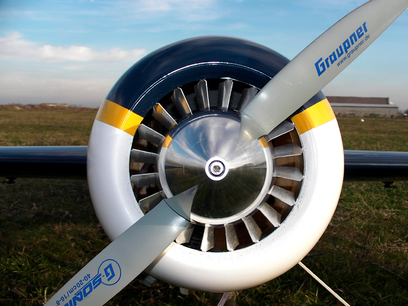 Нещо, което винаги ме дразни в повечето полуготови модели е, че моделистите нехаят за съосието между мотора и капотажа, както и за самата муцуна на даден самолет. Повечето (да не кажа почти всички) Як-ове отпред изглеждат като... една голяма дупка. Грозно... Тук се постарах да направя решетка, донякъде имитираща оригинала (само донякъде), която хем да краси муцуната, хем да помага за охлаждането на двигателя, като завива въздушната струя по посока на най-нагрятата част на мотора - изпускателния отвор. Решетката проектирах сам, а мой приятел я изряза на лазер. Мисля, че се получи не зле.