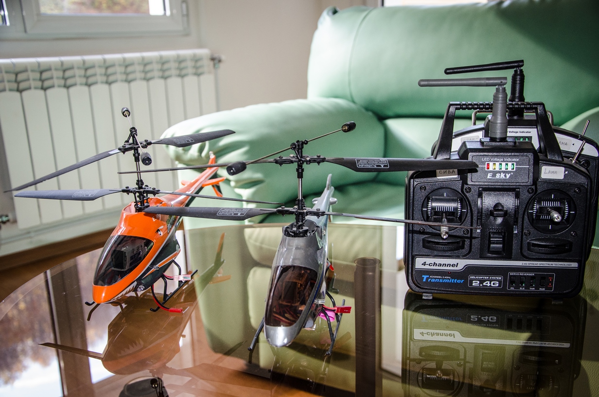 Продавам 2 бр. коаксиални хелита Esky Lama V4. На 4-5 полета. В комплект с 2.4GHz апаратура, 2S LiPo батерия, зарядно и резервни лопати. RTF.