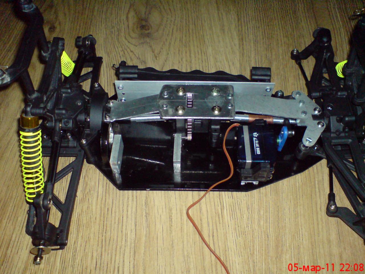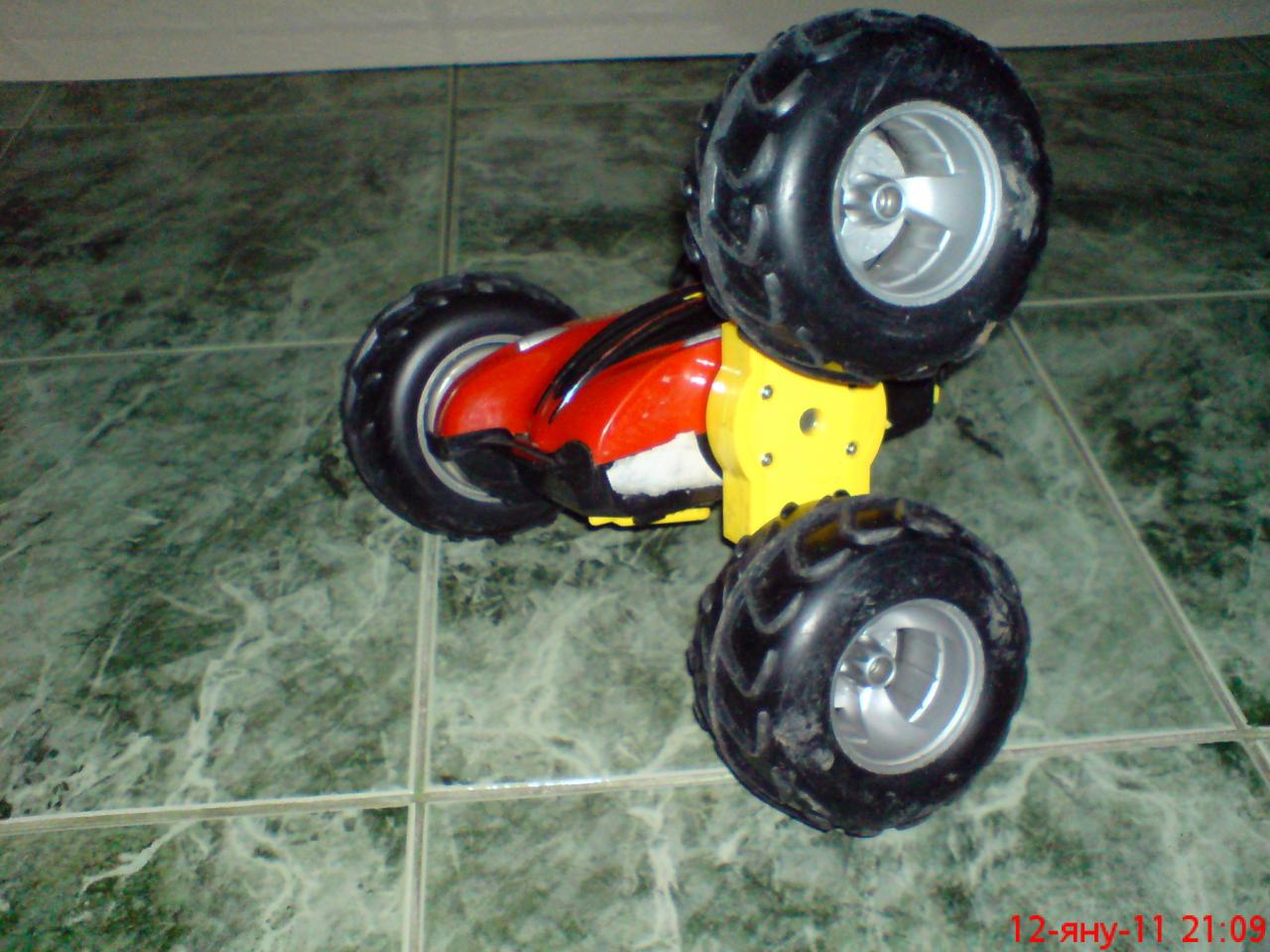 вътре има само два мотора разположени на 180 градуса.редукторите са в страниците и се отварят на ръба на счупването.така че ако искаш снимки от там сори.едните могат да се освободят да се въртят на 360 гр. за пресечена местност или да се застопорят за гладък терен.ако настояваш ще го отворя и ще ти го цъкна и вътре.