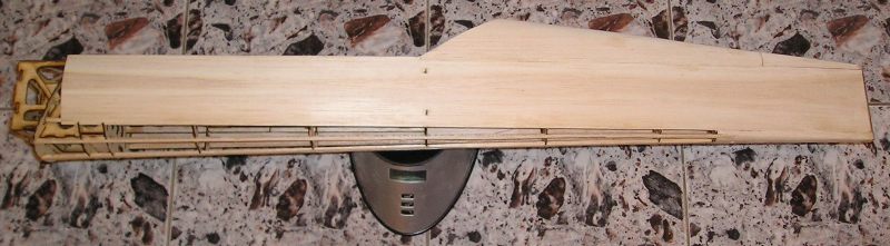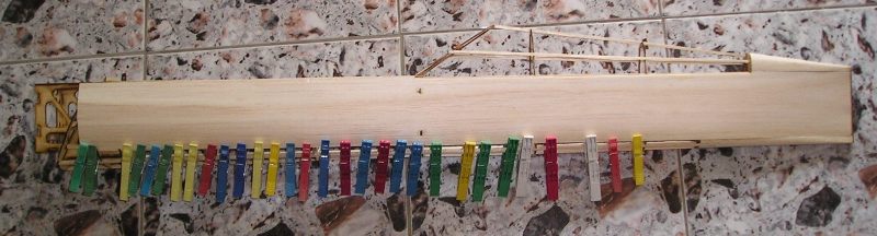 Довърших тялото, облечено със балса тежи 176гр.Малко зор видях със огъването на балсата, но на водна пара се справих с тази задача.
